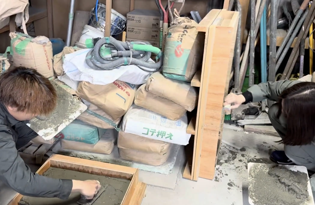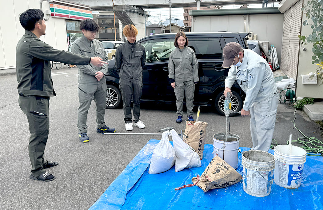先輩の指導のもと、左官工事の流れを覚え、少しずつ実務を通して着実にスキルアップを目指せるのが特長です。